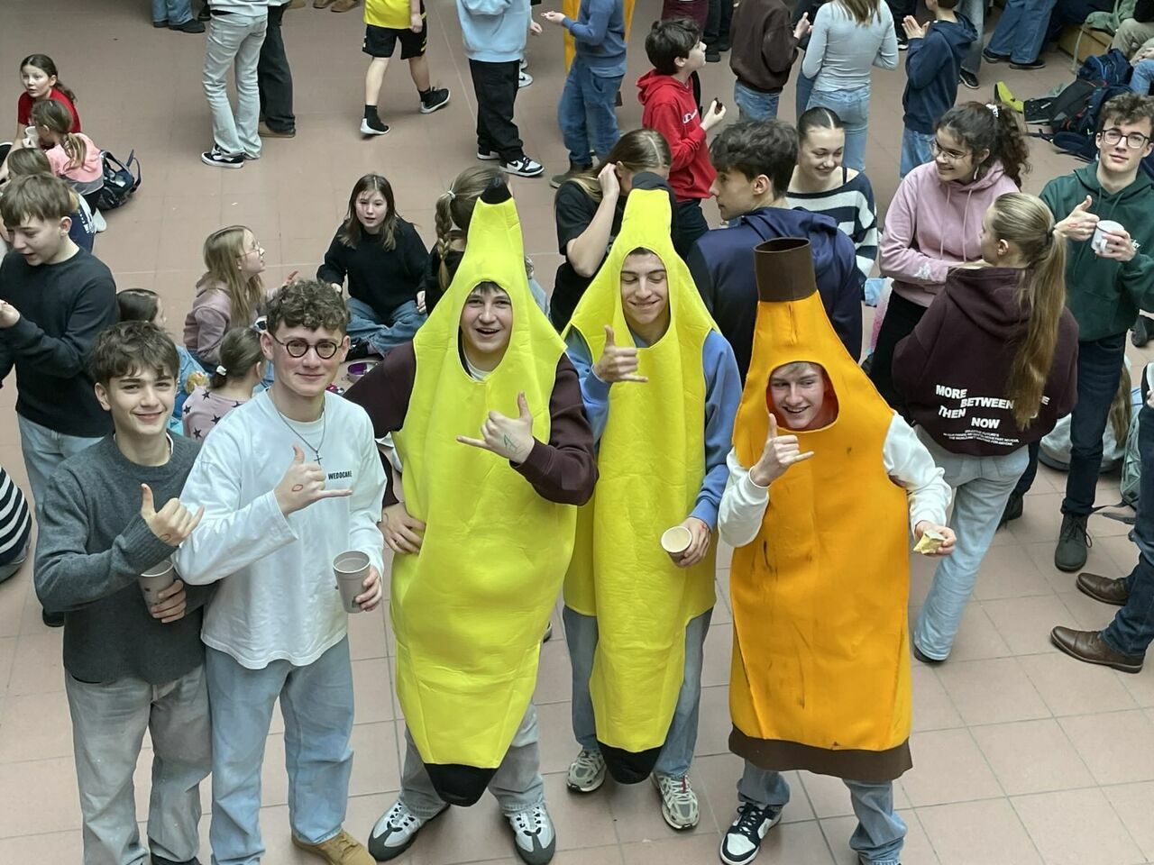 Schon am Morgen wurden alle in der geschmückten Aula begrüßt. Für gute Stimmung sorgten Musik, verkleidete „Bananen“, die fair gehandelte Bananenchips verteilten, sowie Schüler:innen des Weltladenteams. Als symbolische Erinnerung an diesen besonderen Tag erhielt jede und jeder einen Kugelschreiber mit der Aufschrift „10 Jahre Fairtrade-Schule, 10 Jahre Misereor-Partnerschule“, gesponsert von der Firma Schneider. Ein schönes Zeichen dafür, dass jede und jeder die Ideen von Fairness und Verantwortung weiterschreiben kann – heute und in Zukunft. 10 Jahre Einsatz für die eine Welt – für mehr Gerechtigkeit, Nachhaltigkeit und globale Verantwortung – das wurde an den St. Ursula Schulen mit allen gefeiert!